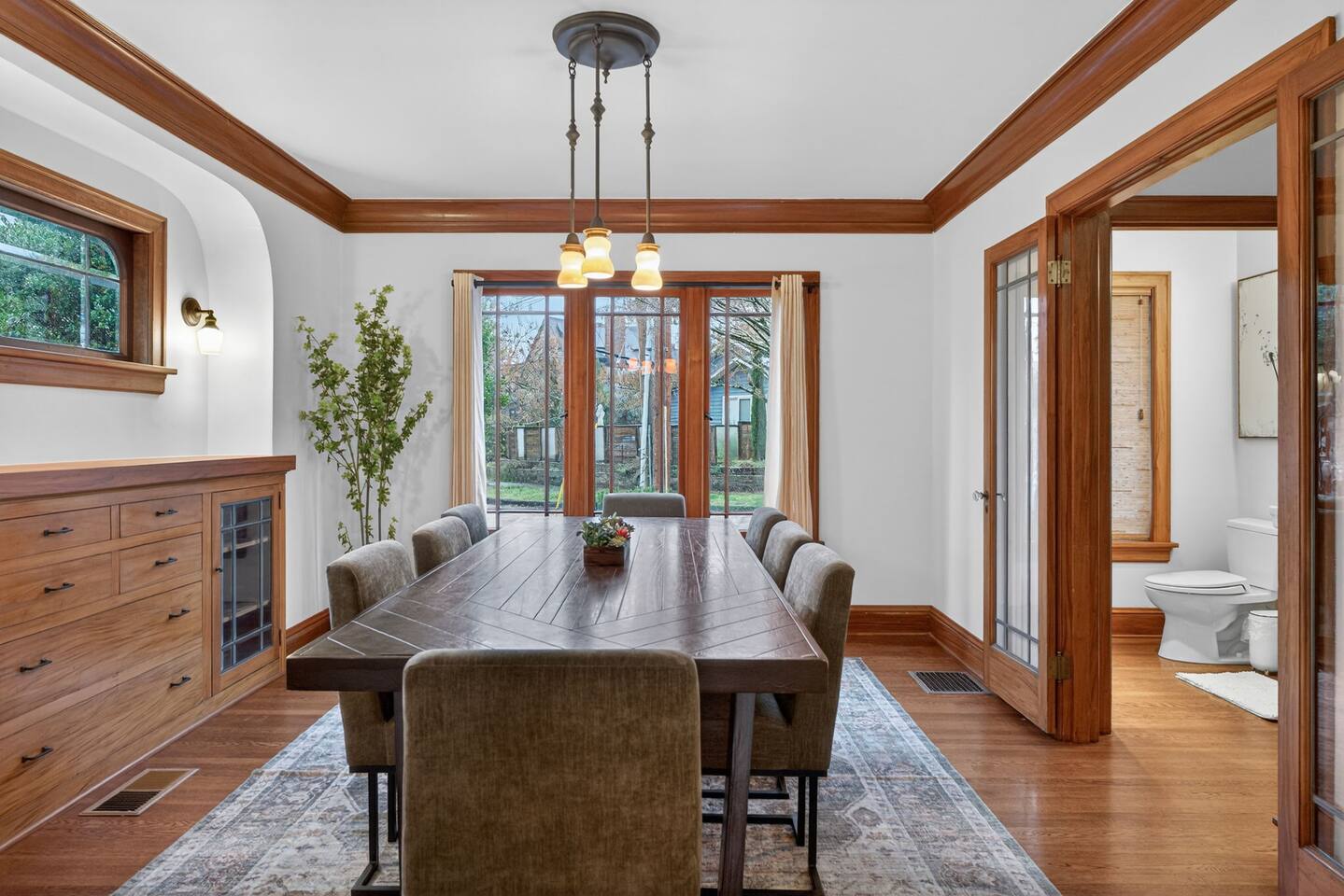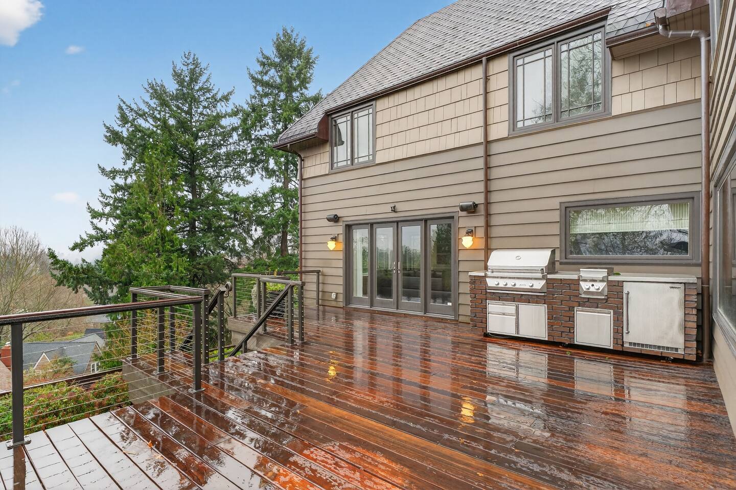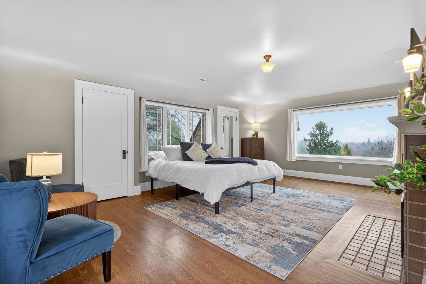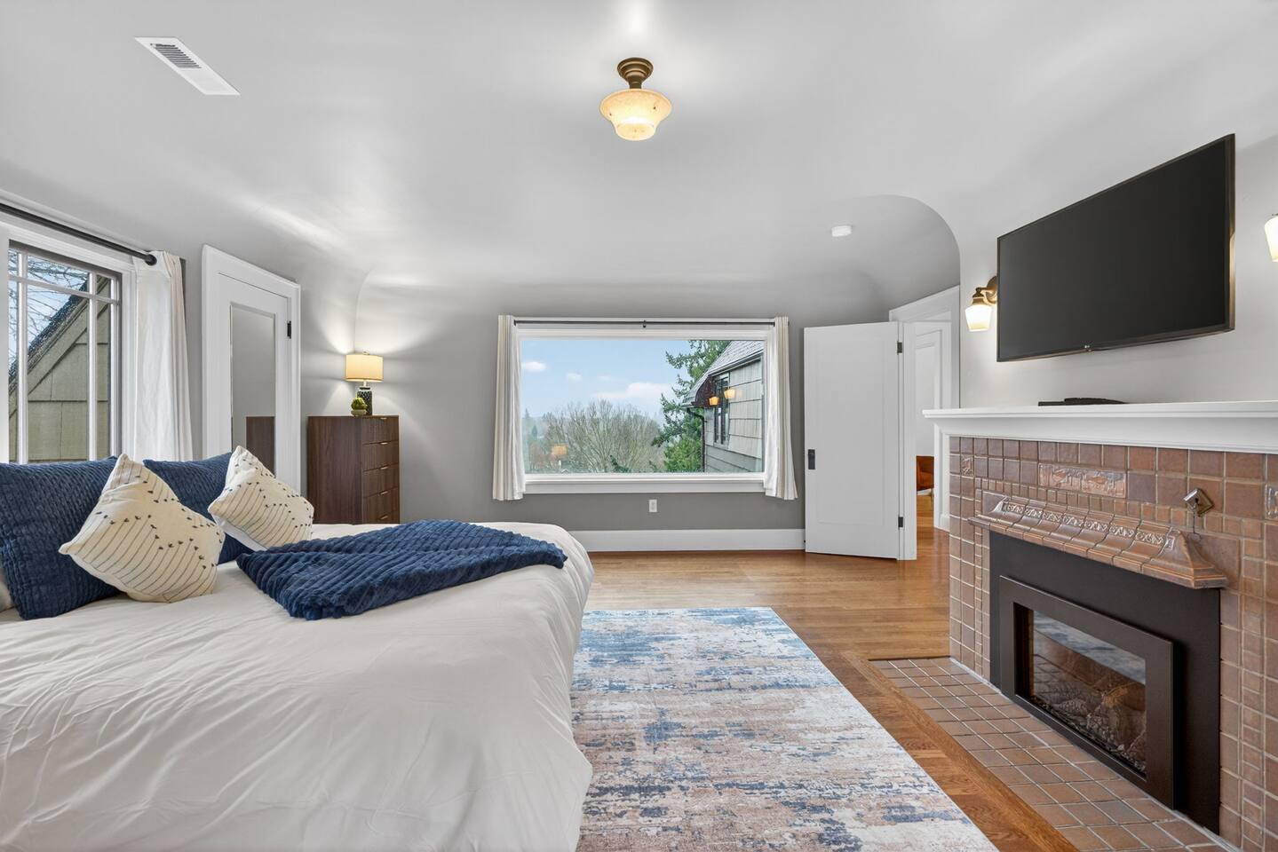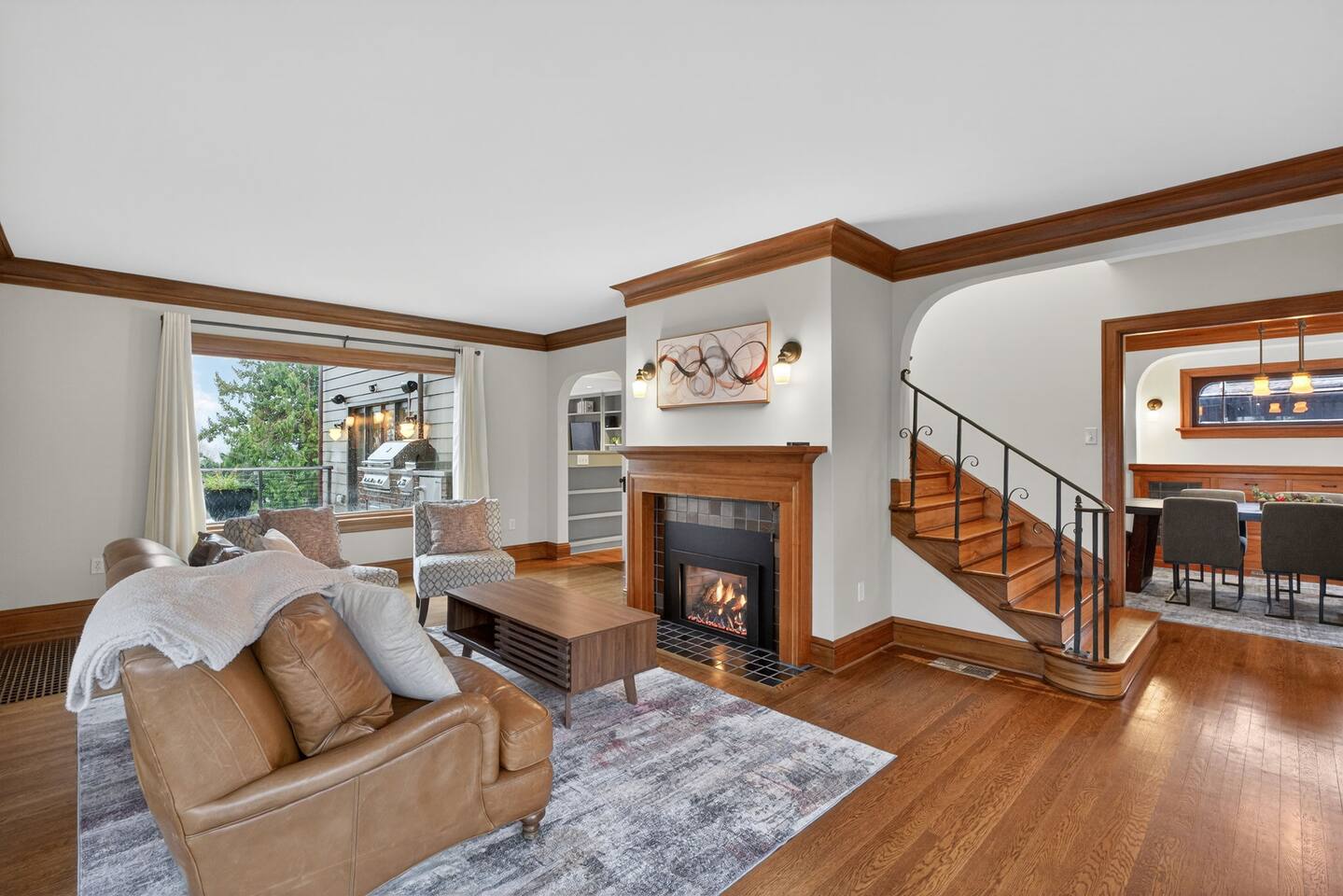 Inside, the home welcomes you with warm architectural details, beautiful hardwood floors, and spacious gathering areas ideal for families or groups. The serene primary suite is a true sanctuary, featuring a cozy fireplace, large windows with peaceful views, and a spa-like atmosphere perfect for unwinding. The bathrooms include upscale finishes, highlighted by a stunning soaking tub set beneath large windows for a relaxing, light-filled experience. For entertainment and activity, the home truly stands out. Enjoy a vibrant game room with a ping-pong table, perfect for friendly competition, as well as a fully equipped workout room to keep up with your fitness routine during your stay. Multiple living and dining areas allow everyone to spread out comfortably while still feeling connected. Step outside to the private patio and backyard, where you’ll find outdoor seating surrounded by greenery, an ideal spot for morning coffee, casual meals, or evening conversations. The outdoor area also features a built-in grill station, making it easy to enjoy al fresco dining. Families will love the yard space, complete with a play structure that adds an extra layer of fun for younger guests. You’re just minutes from some of Portland’s most iconic destinations: Alberta Arts District for dining, coffee shops, and local culture Hollywood District for shopping, entertainment, and essentials Laurelhurst Park for walking trails and outdoor relaxation Easy access to Downtown Portland and major routes for exploring the city and beyond Whether you’re visiting for a family getaway, an extended stay, or a work-from-anywhere retreat, this home blends elevated design with everyday comfort, creating a welcoming space for an unforgettable Portland stay.