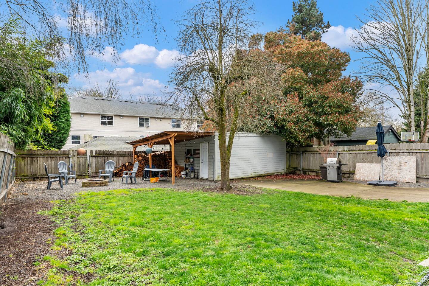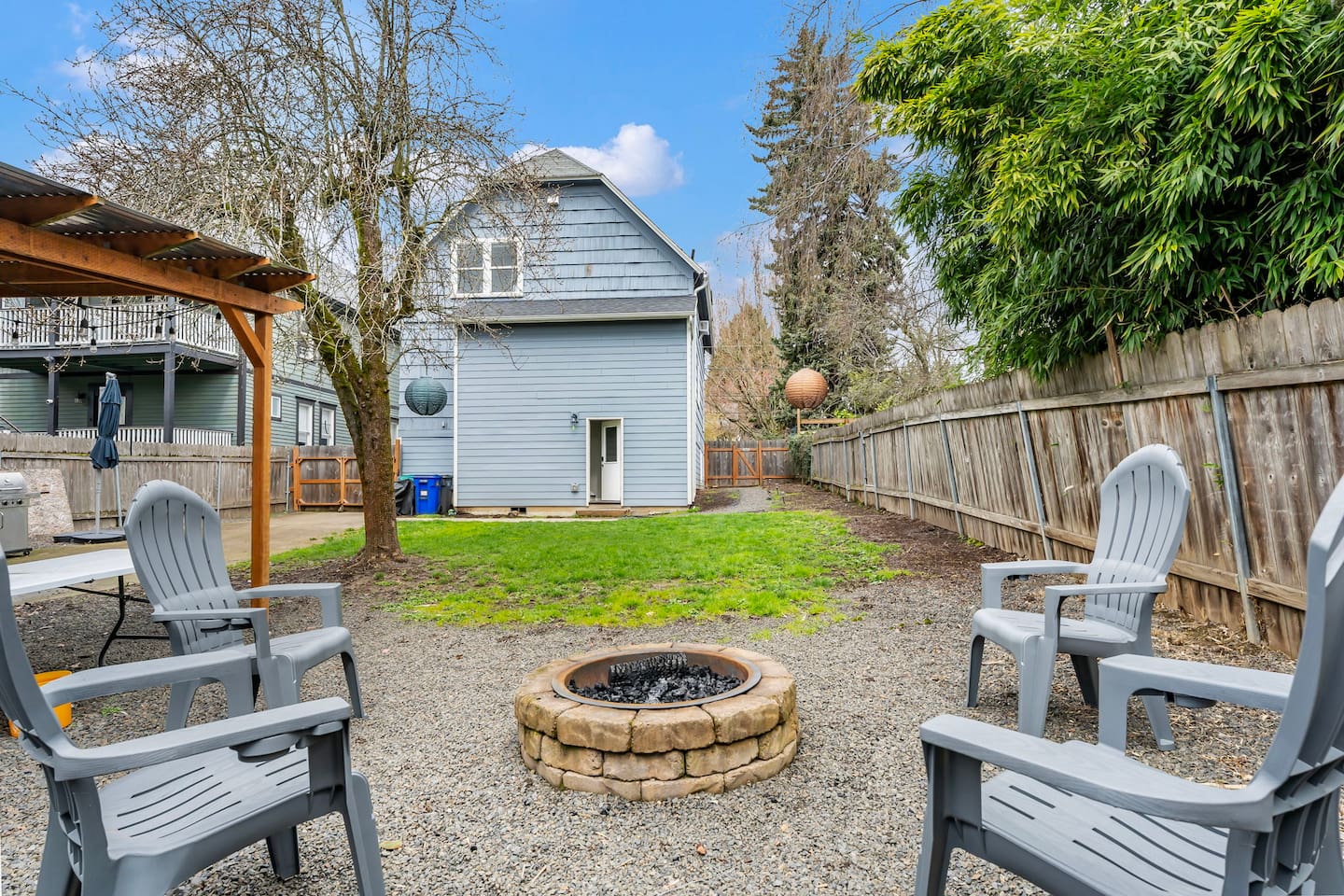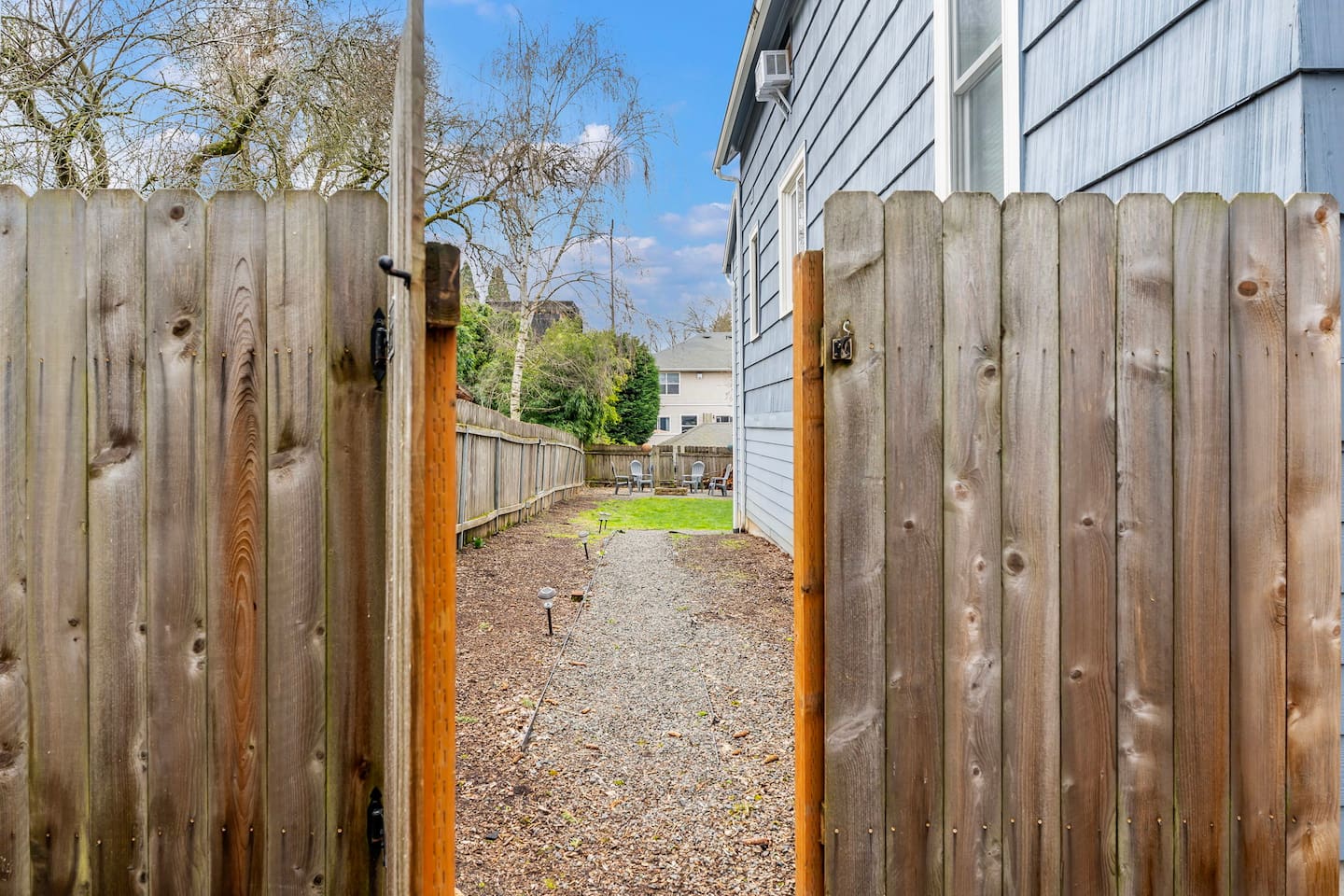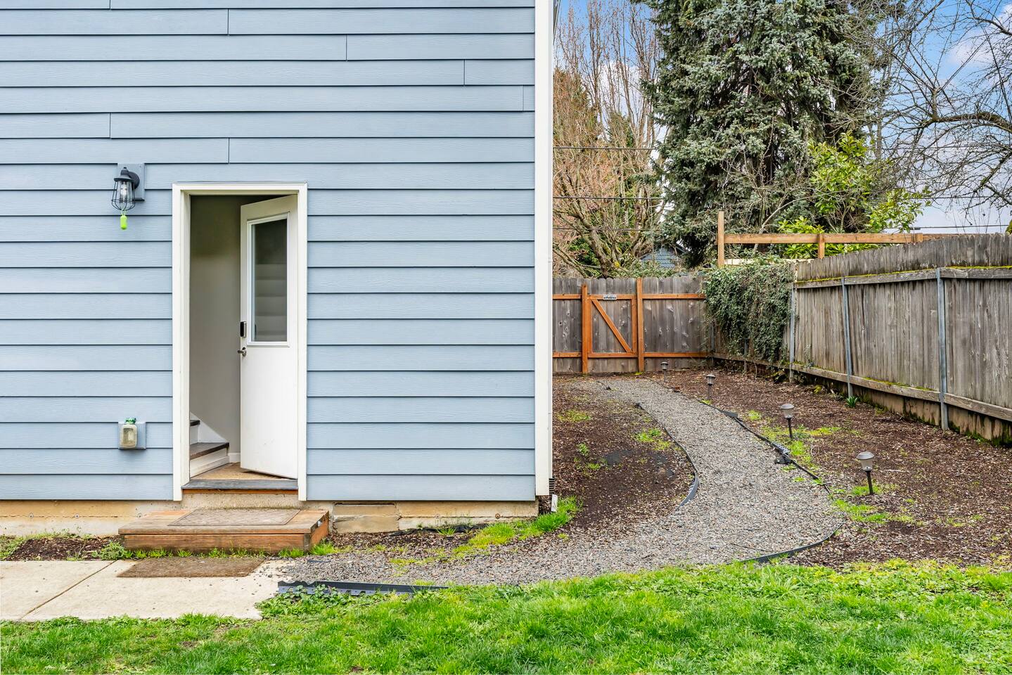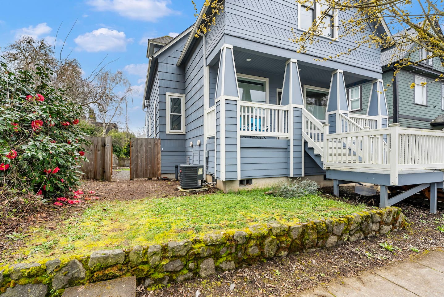 This is a duplex with a tenant upstairs. The driveway is for the upstairs guests and the yard is shared.