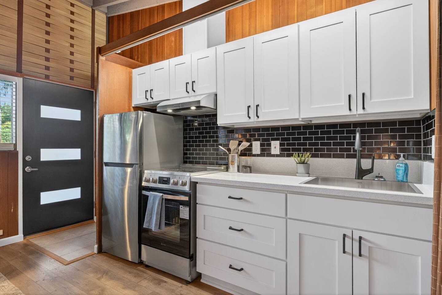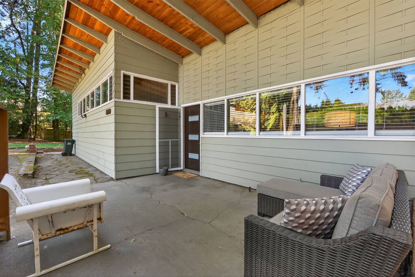 Welcome to your mid-century retreat in the heart of Northwest Portland. This 1-bedroom unit features dramatic vaulted wood ceilings, floor-to-ceiling windows, and rich wood tones that bring warmth and natural light into every corner. We want all guests to feel comfortable and informed. The home is on a main road, so you may notice some traffic noise during the day, though evenings are generally peaceful. Inside, you’ll find a comfortable living area with seating and TV, a well-equipped kitchen and dining space ideal for enjoying home-cooked meals, plus built-in storage to keep things tidy. The refreshed bathroom features a modern shower and all the essentials you’ll need during your stay. Step outside to your private patio or wander the by mature trees. Onsite laundry and extra storage make extended stays convenient and stress-free. 🌟 Neighborhood & Nearby Highlights Forest Park — explore miles of hiking and biking trails right in the vicinity. Portland Japanese Garden & International Rose Test Garden — two of Portland’s most serene and iconic gardens in nearby Washington Park. Pittock Mansion — a historic home perched in the hills with sweeping views over the city. NW 23rd Avenue / Nob Hill — just a short stroll or drive away, lined with boutique shops, cafés, galleries, and local flavor. Ken’s Bakery — a local favorite for breakfast or brunch, perfect for a morning treat before exploring the neighborhood. Whether you're here for work, relaxation, or exploration, this unit offers a perfect home base: peaceful, stylish, and minutes from nature, gardens, and Portland’s charming NW neighborhoods.