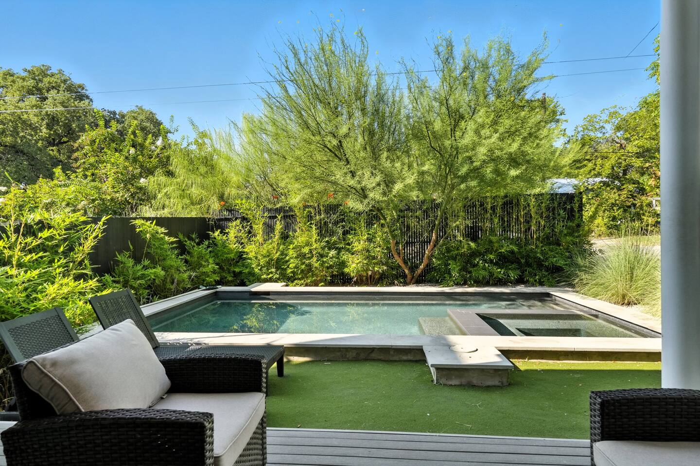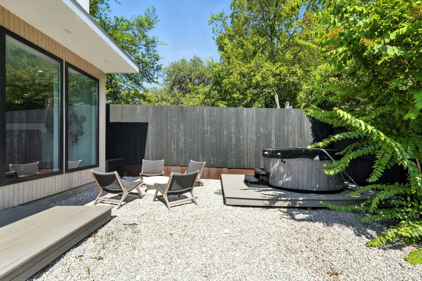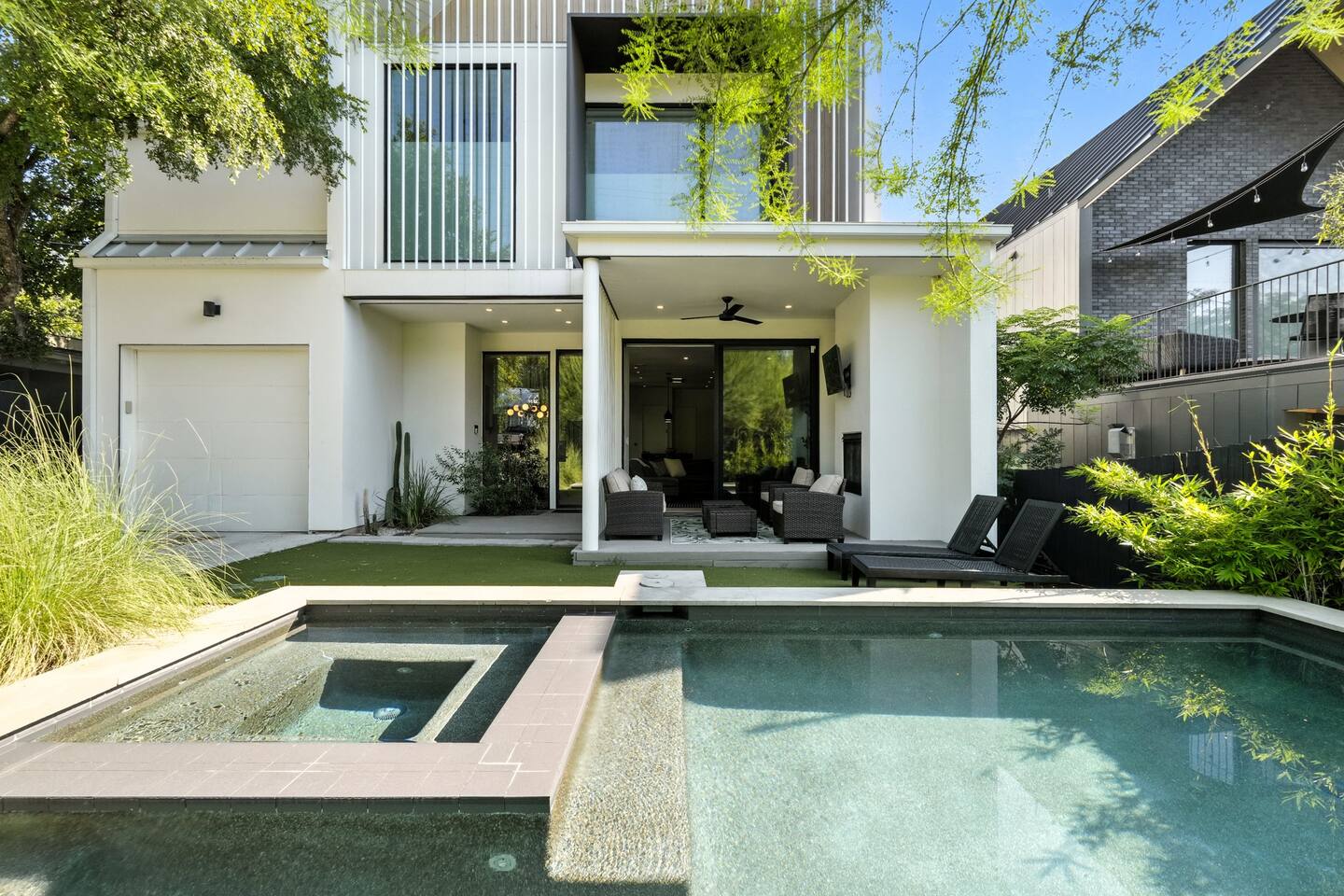 Welcome to Your Austin Luxury Escape! Discover a one-of-a-kind retreat in Austin’s coveted Bouldin Creek, where modern design meets resort-style comfort. This estate - designed by Joseph Design Build and recently reimagined with elegant upgrades - is more than a home. It’s a destination for unforgettable moments. Just minutes from downtown Austin’s restaurants, nightlife, and music scene, the property offers the perfect balance of privacy and convenience. Whether you’re planning a bachelorette weekend, wedding celebration, family reunion, or corporate retreat, you’ll find space, style, and serenity here. Designer Living Spaces: - Soaring ceilings & glass walls create bright, open living areas filled with natural light. - A sleek chef’s kitchen with high-end appliances anchors the great room - ideal for cooking, entertaining, and sharing meals. - Designer furnishings and refined finishes make every corner feel elevated yet welcoming. Resort-Style Outdoor Oasis: - A sparkling pool and two private hot tubs provide the ultimate relaxation. - Lush landscaping, multiple courtyards, and a covered patio with fireplace set the stage for cocktails, late-night conversations, and group gatherings. - Imagine morning swims, afternoon lounging, and evening champagne toasts under the Texas sky. Spacious & Flexible Accommodations: - Main residence sleeps 12, including a spa-like primary suite with soaking tub and walk-in shower. - Detached guesthouse sleeps 6, complete with its own entrance and garage - perfect for extra guests, staff, or those seeking privacy. - Together, both homes sleep up to 18 guests, giving your group room to spread out while staying connected. Perfect for Every Occasion: This home was designed for making memories: - Celebrate a bachelorette weekend by the pool. - Host an intimate wedding weekend with friends and family. - Gather your team for a stylish and productive corporate retreat. - Enjoy a relaxed family reunion in one of Austin’s most walkable and charming neighborhoods. Location Highlights: - Situated in Bouldin Creek, one of Austin’s most desirable neighborhoods. - Walkable to local coffee shops, dining, and boutiques. - Minutes to downtown Austin, Lady Bird Lake, and South Congress Avenue. Why Guests Love This Home: “Spacious and luxurious - perfect for our group getaway.” “The pool and hot tubs made our trip unforgettable.” “Walkable to restaurants and nightlife - yet still peaceful and private.” Key Features at a Glance: - Two modern homes (main + guesthouse) - Sleeps up to 18 guests - Pool + 2 hot tubs - Chef’s kitchen & open-plan living - Covered patio with fireplace - Bouldin Creek, minutes to downtown